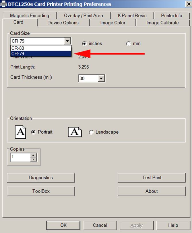 • Change the card size from CR80 to CR79. Click OK.