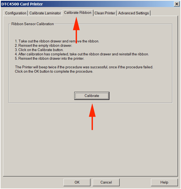 If your DTC4500e ID card printer is not properly recognizing your ribbon, either by not recognizing the type of ribbon or acknowledging that a ribbon has been replaced, you will need to calibrate the ribbon sensors on your printer.