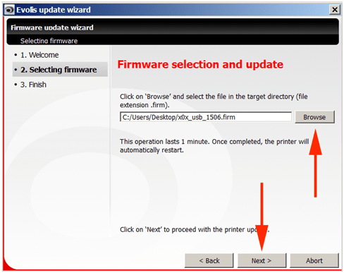 • Navigate to the firmware .firm file you downloaded from Evolis and saved on your desktop. Click Next.