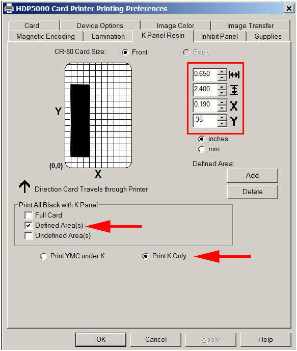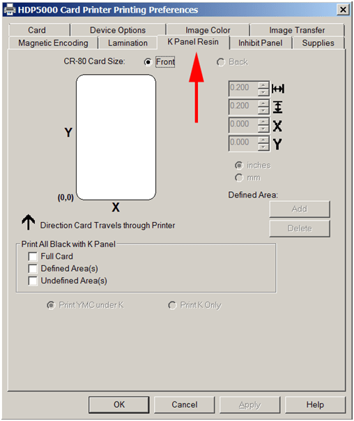 To print a barcode on the front of your card, you will first need to define the resin (K) area.