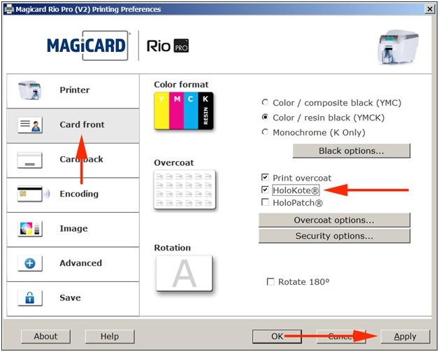 • Click on the Card Front menu. Uncheck the box next to HoloKote.