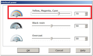 • Increase the Yellow, Magenta, Cyan power to 70. Please note: do not increase the power over 90, this will cause the ribbon to break due to the heat. Click Apply, and print another test card.