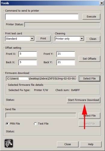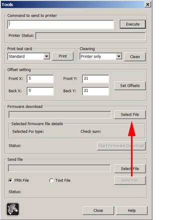 • Click on Select File. Browse to the firmware file that you downloaded from the Zebra website and click Execute.